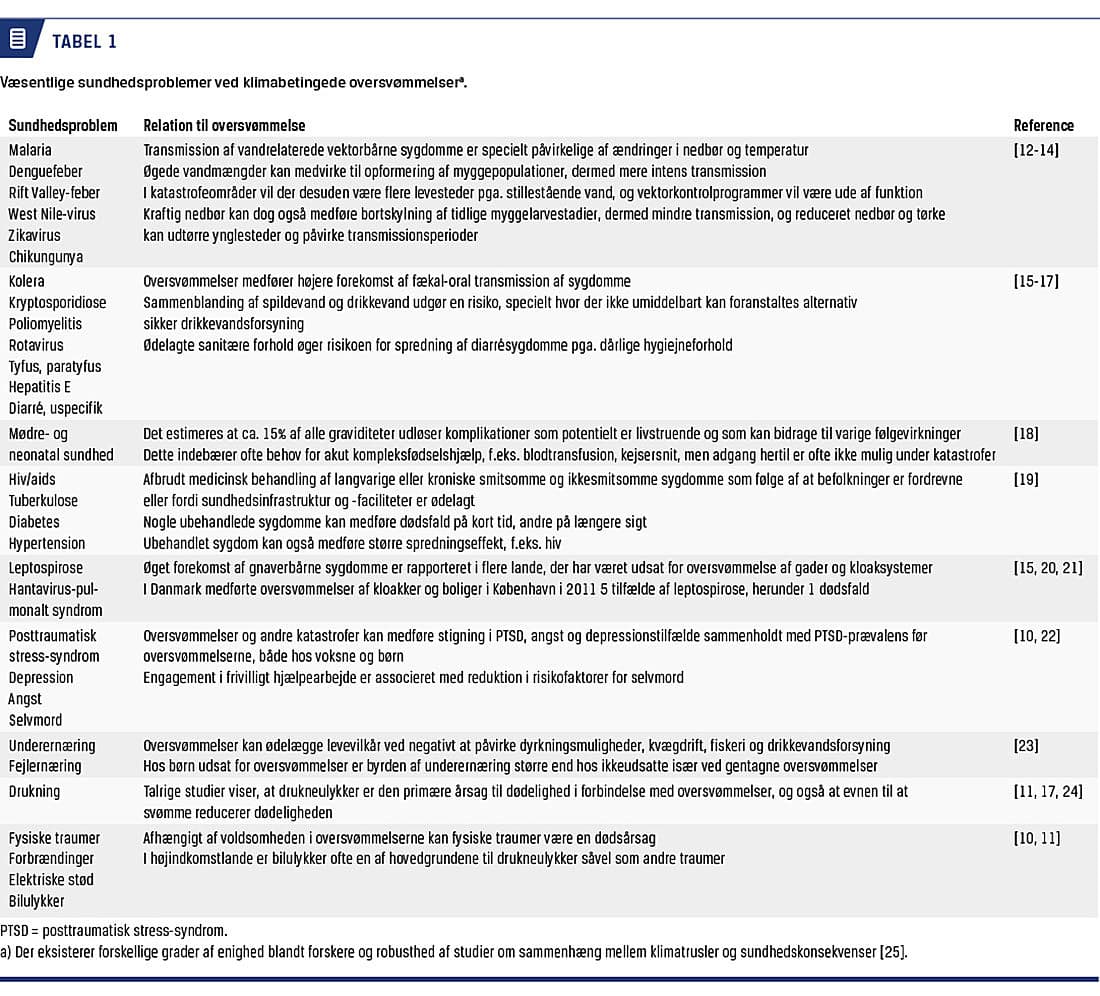 I det følgende gives der en oversigt over og en diskussion af, hvorledes sundhedsaktører kan bidrage til at løse akutte og mere langsigtede sundhedsopgaver. Oversvømmelser er valgt som et typeeksempel på trusler, der i dag anses for at være årsag til flest katastrofer samt mest sygelighed og død [7]. Deres kobling til betydningsfulde determinanter for sundhed, såsom geografi, topografi, miljø, socioøkonomiske forhold og demografi inklusive urbanisering, anses for at være vigtig i myndighedernes tværsektorielle bestræbelser på klimatilpasning nationalt og lokalt.