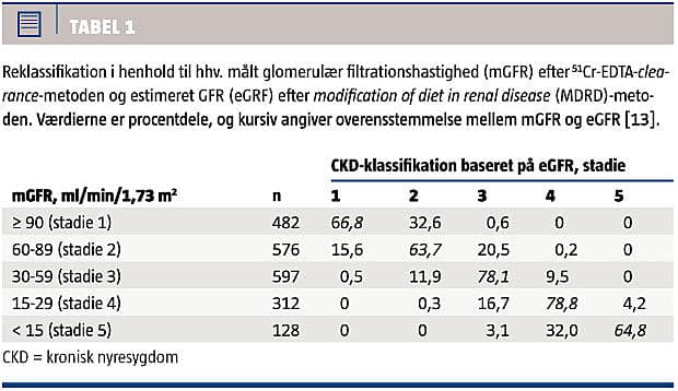patienter uden kendt CKD. Den manglende præcision i estimatet leder uundgåeligt til, at en gruppe af patienter fejlklassificeres (Tabel 1). Som nævnt har MDRD-formlen tendens til generelt at underestimere nyrefunktionen, specielt hos patienter med eGFR > 60 ml/min/1,73 m2, hvilket Rossing et al også har påvist gjaldt hos en gruppe patienter med type 2-diabetes. Her fandt de også, at faldhastigheden i eGFR var signifikant underestimeret [15]. Denne fejlklassificering af patienter kan medføre unødig sygeliggørelse og øget pres på sundhedsydelser.