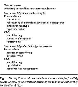 I 1998 formulerede en gruppe førende smerteforskere (1) et oplæg, der havde til formål at sætte fokus på mekanismebaseret klassifikation af smerte. Klassifikationen skulle sikre, at der blev stillet relevante spørgsmål, så en optimal behandlingsstrategi kunne vælges. Woolf et al (1) delte smerter op i tre kategorier: transiente, vævsskaderelaterede og nerveskaderelaterede smerter (Fig. 1).