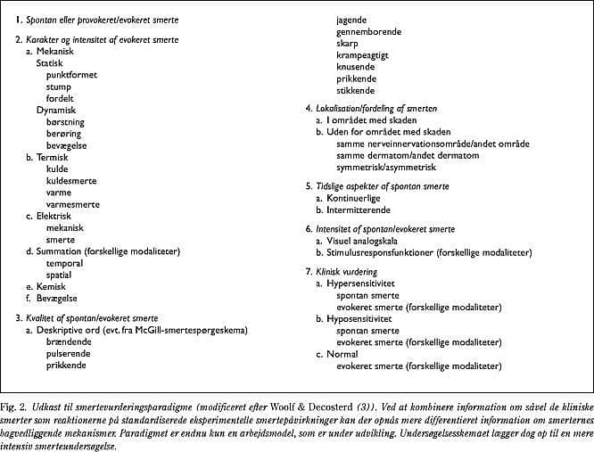 Woolf & Decosterd (3) foreslog efterfølgende et paradigme til kvalitativ og kvantitativ vurdering af smerter og behandling. En revideret tentativ version af dette paradigme ses i Fig. 2.