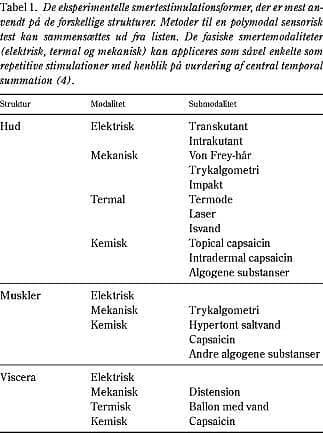 De forskellige smertestimulationsmetoder aktiverer forskellige baner og mekanismer, hvorfor det ved eksperimentelle og kliniske smertestudier er vigtigt at kombinere et antal metoder for at få et differentieret billede af de forskellige smertekomponenter (Tabel 1). Konceptet, polymodal sansefysiologisk test er i dag gældende standard på området. Tendensen går i øjeblikket i retning af desuden at have et testbatteri, der involverer flere vævstyper (hud, muskel og viscera) (4).