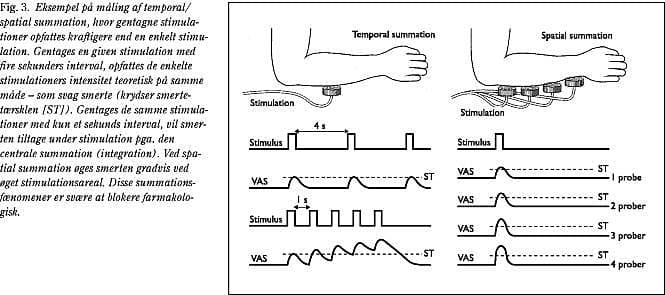 Det er påvist i elektrofysiologiske dyrestudier, at den neurale fyring gradvis øges som funktion af antallet af repetitive stimulationer. Interstimulationsintervallet i såvel studier med mennesker som i dyrestudier skal være mindre end ca. 3 s, for at integrationsprocessen aktiveres. Processen er NMDA-receptor-medieret integration af excitatoriske post-synaptiske potentialer (EPSP). Hos mennesker betegnes mekanismen temporal summation og hos dyr betegnes mekanismen wind-up. Temporal summation er en potent mekanisme og således vigtig for en mekanismebaseret klassifikation (5). Fænomenet er illustreret i Fig. 3.