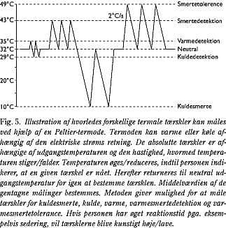 De mest anvendte metoder er de psykofysiske, hvor en given stimulation øges i intensitet, indtil der udløses en sensation (detektionstærskel), en detekterbar smerte (smertetærskel) eller en maksimal smerte (tolerancetærskel). Ved at anvende forskellige tærskler kan forskellige afferente fiberpopulationer rekrutteres, henholdsvis Aβ-, Aδ- og C-fibre (4). Måling af en varme (C-fibre)-, smerte (Aδ-fibre)- og tolerance (C-fibre)-tærskel til termal stimulation er illustreret i Fig. 5. En sådan termal stimulation med forskellige temperaturer kan således anvendes til at vurdere tilstanden i forskellige nervefiberpopulationer.