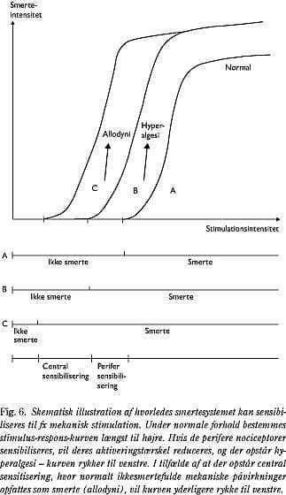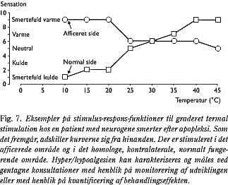 I forbindelse med eksempelvis nerveskader/degeneration og efterfølgende neuropatiske smerter kan der udvikles områder med smerteoverfølsomhed over for normalt ikkesmertefulde mekaniske eller termale stimulationer. I forbindelse med sansefysiologiske målinger er det derfor nødvendigt også at inkludere test, som kan aktivere de normalt ikkesmerteførende baner for at kunne kvantificere denne omkodning (Fig. 6). I stedet for blot at måle en tærskelværdi kan der opnås mere information ved at bestemme stimulusrespons-funktioner, hvor den evokerede smerteintensitet scores (på en visuel analogskala [VAS]) for øget stimulusstyrke. I forbindelse med forskellige lidelser (fx neurogene smerter) kan det ses, at tærsklen er normal, hvorimod der kan udvises hyperalgesi ved kraftig stimulation (Fig. 7).