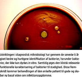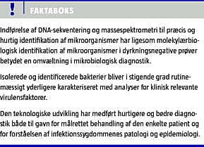 I løbet af det seneste tiår er der gradvist indført identifikation af bakterier ved sekventering af DNA [6, 7]. Denne teknologi betyder, at man for nogle bakteriearters vedkommende kan opnå en både hurtigere og mere præcis identifikation, end det er muligt med dyrkningsbaserede teknikker alene. Brug af DNA-sekventering har ført til påvisning af en række i Danmark hidtil upåagtede bakterieinfektioner [8-11]. Eksakt identifikation med konventionelle metoder kan for nogle bakterier tage uger. Med DNA-sekventering opnås bakteriediagnosen på en til to dage, dvs. mens det stadig har betydning for behandlingen af den enkelte patient. Dermed bliver præcis identifikation af disse bakterier klinisk relevant, hvilket er et vigtigt fremskridt i klinisk mikrobiologi. Indførelse af DNA-sekventering til rutinebrug i klinisk diagnostik bidrog til påvisning af, at mange bakterier, der tidligere var anset for at være apatogene, rent faktisk kan forårsage infektioner hos mennesker. For nogle, som f.eks. den urinvejspatogene bakterie Actinobaculum schaalii , viste det sig, at der ikke var tale om sjældne infektioner [12]. Bakterien stiller særlige krav til atmosfæren for dyrkning in vitro og kan findes relativt hyppigt, hvis prøvematerialet blot inkuberes under passende betingelser. Som illustreret med dette eksempel bidrog DNA-sekventering, der var indført som et diagnostisk hjælpemiddel til gavn for den enkelte patient, til en dybere forståelse af årsager til infektionssygdomme.