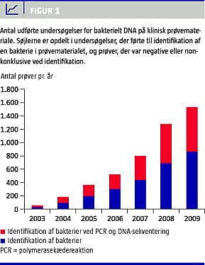 Sekventering af DNA fra bakterier kræver ikke opformering af levende celler. Ved dyrkningsnegative infektioner kan man med PCR kopiere bakterielt DNA direkte fra patientprøver og efterfølgende identificere, hvilke bakterier der er tale om ved DNA-sekventering af det opformerede DNA [13]. Siden påvisning og identifikation af bakterielt DNA i klinisk prøvemateriale blev indført som rutineanalyse har der været en støt stigende efterspørgsel (Figur 1 ). Ud over at tilvejebringe en ellers uopnåelig bakteriologisk diagnose hos den enkelte patient har metoden skaffet viden om, hvilke bakterier der i Danmark forårsager infektioner, fra hvilke bakterierne ikke kan dyrkes. Med metoden er der gjort mange uventede fund [14, 15]. Blandt de mere opsigtsvækkende var påvisning af Q-feber - en sygdom, der associeres med varme lande - i Grønland [16]. Seksuelt overførbare bakterier som Treponema pallidum og Neisseria gonorrhoeae er med metoden fundet som uventede årsager til led- og knogleinfektioner. Hundebidsbakterien Capnocyto-phaga canimorsus , der mest associeres med akutte sepsistilstande, er flere gange fundet som årsag til langvarige vaskulære infektioner. Ekstrapulmonal tuberkulose er primært påvist med denne metode i flere tilfælde i Danmark.