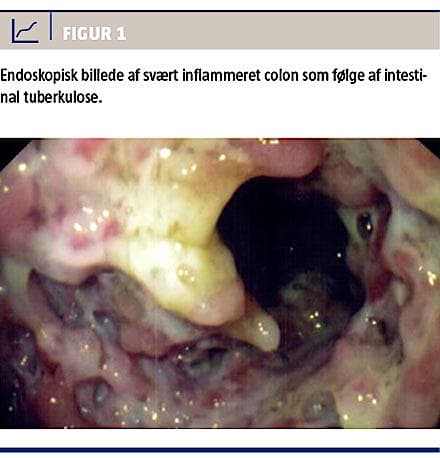Det kliniske og endoskopiske billede var foreneligt med CD, og man overvejede iværksættelse af steroidbehandling. T-spot-tb var imidlertid positiv, og patienten oplyste, at hendes bror havde haft pulmonal tb nogle år forinden. Patienten havde sparsom ekspektoration, og der kunne ikke påvises Mycobacterium tuberculosis. Koloskopi blev gentaget for at sikre relevant materiale, men også disse biopsier var mikroskopi-, PCR- og senere også dyrkningsnegative. Ud fra en samlet klinisk vurdering valgte man at påbegynde firestofs-tb-behandling med god respons i form af vægtøgning, normalisering af afføringen og almen bedring.