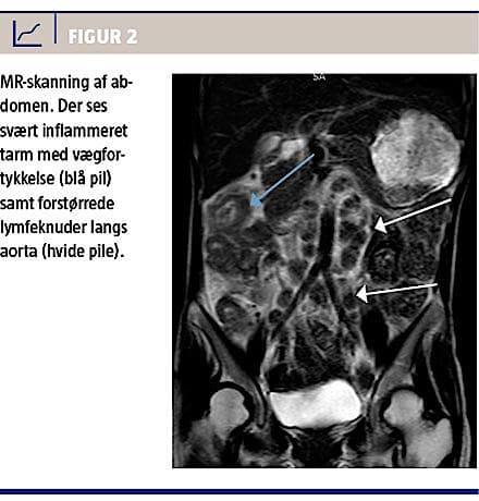 Koloskopien viste nekrotiske områder med cobblestone-tegning i transversum frem til højre fleksur, hvor man ikke kunne komme videre frem pga. forandringerne (Figur 1). En MR-skanning viste flere steder fortykkelse af tarmvæggen, betydeligt ødem ileocøkalt og forstørrede glandler paraaortalt og langs iliacakarrene (Figur 2).