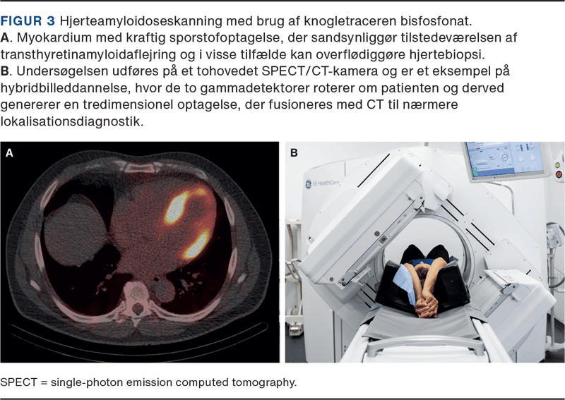 Klinisk fysiologi og nuklearmedicin har en lang forskningstradition med fokus på udvikling og afprøvning af metoder og medicinsk udstyr. I nogle tilfælde har et lægemiddels optagelsesmekanisme vist sig at åbne nye anvendelsesmuligheder. Knogletracere baseret på bisfosfonat, der via indbygning i hydroxyapatitkrystaller afspejler knoglenydannelse, har været benyttet til påvisning af mikrokalcifikationer i forbindelse med myokardieinfarkter, idiopatisk inflammatorisk myopati og calcifylaksiaflejringer. Aktuelt finder klassisk knogleskintigrafi anvendelse ved mistanke om amyloid transthyretinamyloidose (ATTR) med kardiel involvering (Figur 3). Den er en billig, noninvasiv og patientvenlig undersøgelse, der med høj sikkerhed kan identificere amyloidosepatienter, der vil have gavn af målrettet behandling [5]. Skintigrafi med metaiodobenzylguanidin (MIBG), der i lighed med noradrenalin optages i neuroendokrine celler via et transportprotein i plasmamembranen, blev udviklet til påvisning af fæokromocytom/neuroblastom, men kan også fremstille hjertets innervation og har fået en anden berettigelse, efter man er blevet opmærksom på, at hjertets sympatiske nervefibre påvirkes tidligt ved Parkinsons sygdom [6].