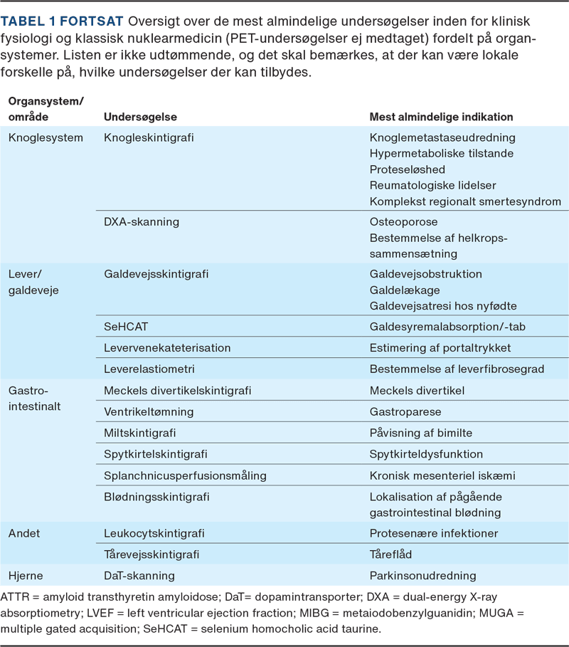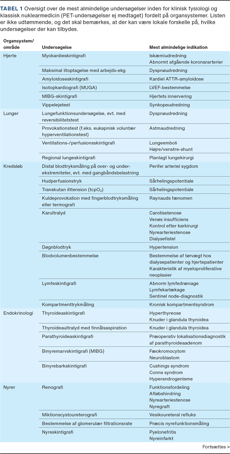 Klinisk fysiologi og nuklearmedicin blev godkendt som lægeligt speciale af Sundhedsstyrelsen i 1982 [1]. Indtil da udførtes klinisk fysiologiske funktionsundersøgelser typisk i centrallaboratorier og radiokemiske analyser foruden billeddiagnostik i isotoplaboratorier. Fælles var en dybdegående forståelse af organfysiologi samt et solidt kendskab til strålebiologi og kinetik. Disse principper er stadig centrale inden for funktionsdiagnostik [2]. I takt med den hastige udvikling har PET fået en dominerende plads, men der findes fortsat en række indikationer, hvor klinisk fysiologiske og klassisk nuklearmedicinske undersøgelser spiller en vigtig rolle (Tabel 1).