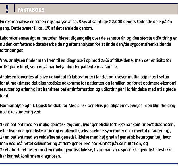 Vi har selv på vores afdelinger eksempler på måske mindre mirakuløse sager, men tilfælde, hvor exomsekventering har ledt til fastlæggelse af diagnosen. Vi har haft sager, hvor der er fundet mutationer i kendte gener, hvilket der ikke var mistanke om ud fra klinikken. Vi har haft sager, hvor der i gener er fundet nyopståede mutationer, som vi ikke kender betydning af, og tilfælde med mutationer i to gener, hvor det er svært ud fra klinikken at afgøre, hvilket gen der kan forklare patientens symptomer. Desuden har vi haft cases, hvor vi trods kæmpe arbejdsindsats med exomsekventering hos endda flere familiemedlemmer ikke er kommet igennem med en diagnose. Yang et al [3] fandt den korrekte diagnose hos 25%, andre har fundet den korrekte diagnose hos op til 50% [4]. Forskellen kan nok forklares ud fra, hvor god man er til at udvælge de tilfælde, hvor brug af exomsekventering er oplagt – det foregår bedst i multidisciplinære sammenhænge. Der er en række sygdomme, hvor exomsekventering ikke er så oplagt. F.eks. er teknologien ikke så velegnet til trinukleotid-repeat-sygdommene som f.eks. Huntingtons sygdom. Sygdomme med større genomiske rearrangementer/aneuploidier, pseudogener eller epigenetiske ændringer er andre udfordringer, og så er der gener, der bare dækkes dårligt med exomsekventering. Endnu.