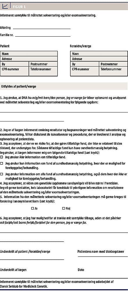 Dansk Selskab for Medicinsk Genetik har udarbejdet en fælles patientinformation og samtykkeerklæring, som løbende vil blive justeret (Figur 1). Denne samtykkeerklæring kan anvendes som en god støtte til den samtale, som bør foretages, før det besluttes, om analysen skal iværksættes [9]. Her er det vigtigt, at patienten forstår, hvilke konsekvenser en exomsekventering kan få for både individet og hele familien [10]. Denne fremgangsmåde er i overensstemmelse med anbefalingerne i Det Etiske Råds redegørelse over genomundersøgelser fra 2012 [11].