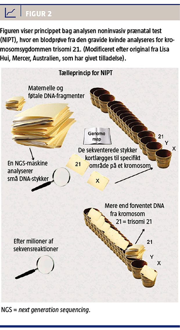 Exomteknologien er også på vej ind i fosterdiagnostikken. I dag kan foregå ved exomsekventering af fostre fra aborter, hvor man har mistanke om arvelige syndromer med betragtelig gentagelsesrisiko. Nu arbejdes der på at indføre teknologi i Danmark til at undersøge små mængder delvist nedbrudt foster-DNA i kvindens blod (noninvasiv prænatal test (NIPT)). Her sekventeres tusindvis af små stykker DNA, for at man kan identificere, hvor DNA-stykket kommer fra. Tælles der nok stykker, vil man f.eks. kunne se, at der er signifikant flere stykker fra kromosom 21 end fra de andre kromosomer, og at fostret derfor har trisomi 21 (Downs syndrom). Dette gælder også for andre trisomier som f.eks. 13 og 18. Den nuværende risikovurdering i første trimester forventes at blive suppleret med NIPT inden for det næste år for både aneuploidi og sygdomsrelaterede deletioner/duplikationer hos fostre (Figur 2).