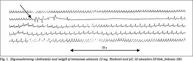 En 64-årig mand blev indlagt akut med hjertebanken af få timers varighed, man fandt ingen angina pectroris. Gennem det seneste år havde han haft intermitterende atrieflagren, men var i øvrigt hjerterask. Patienten var blevet DC-konverteret to gange tidligere. Han var blevet antiarytmisk behandlet med Rytmonorm (propafenon) 300 mg × 2 og herudover inhalationsbehandlet med β 2-agonist og steroid på baggrund af kronisk obstruktiv lungesygdom. Patienten blev fundet akut medtaget og dyspnøisk med BT 100/80 mmHg og puls 180. Ekg viste regelmæssig rytme og ingen sikre P-takker, uændret fra tidligere inkomplet venstresidig grenblok.