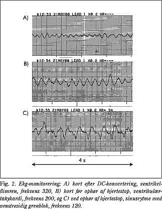 Da patienten blev forsøgt DC-konverteret var hjerterytmen udelukkende observeret via defibrillatoren. Denne har ikke hukommelse og udskriver ikke hjerterytmen automatisk. Cirka 30 s efter hjertestoppet blev der optaget en ekg-strimmel, og på denne sås 120 s uden QRS-komplekser: primært ventrikelflimren, frekvens 320, herefter ventrikulær takykardi, frekvens 200 og endelig sinusrytme med venstresidigt grenblok, frekvens 120 (Fig. 2 ). Desværre kan man ikke dokumentere: 1) at DC-konverteringen blev forsøgt udført synkroniseret, 2) hjerterytmen i forbindelse med og umiddelbart efter DC-konverteringen og 3) tidslængden af hjertestoppet.