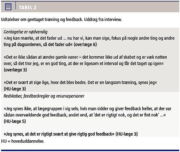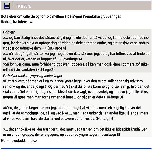 Denne form for kommunikationstræning forstyrrer tydeligvis forholdet mellem de hierarkiske grupperinger på afdelingen (Tabel 1). Lægerne har været meget optagede af projektet og har oplevet, at det har sat sig spor på afdelingen, men også at det fadede ud, når andre ting kom i fokus. Flere nævnte, at det ville være af betydning, at man gentog træningen (Tabel 2).