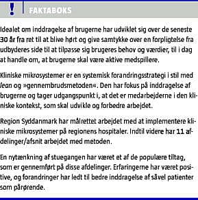 Brugerinddragelse har udviklet sig de seneste 30 år fra ret til at blive hørt og give samtykke over at tilpasse sig brugeres behov til i dag at lade brugerne være aktive medspillere. Kliniske mikrosystemer er en systemisk forandringsmodel, der har et særligt fokus på inddragelse af brugerne, og på at det er medarbejderne i klinikken, som skal udvikle og forbedre arbejdet. Region Syddanmark har arbejdet med implementering af kliniske mikrosystemer på regionens sygehuse. Indtil nu har 11 afdelinger/afsnit arbejdet med metoden. En nytænkning af stuegangen har været et af de populære tiltag. Erfaringerne har været positive, og forandringer har ledt til bedre inddragelse af såvel patienter som pårørende.