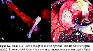 Til aflukning af ductus cysticus ved laparoskopisk kolecyst-ektomi anvendes der hovedsagelig uresorberbare endoklips af metal eller polymert materiale. Migration af disse endoklips til ductus cholodochus har givet anledning til dannelsen af symptomgivende sten omkring klipsene [1]. Vi beskriver et tilfælde, hvor en endoklips to måneder efter operationen afgik fra ductus choledochus gennem papilla Vateri i forbindelse med en endoskopisk stenekstraktion.