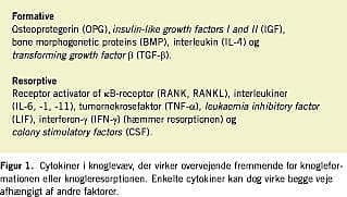 Cytokiner med betydning for knoglemetabolismen opdeles traditionelt i dem, der primært fremmer knogleformationen, og dem, der primært fremmer knogleresorptionen (Figur 1 ).