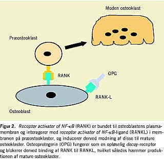RANKL er fundet i tre former: Membranbundet, trunkeret ektodomæne og en primært secerneret form. Forskellige celletyper fra flere organsystemer, inklusive osteoblaster, udtrykker den bundne form, mens den opløselige RANKL, der kan måles i serum, hovedsagelig produceres af T-celler [7]. Aktiviteten af RANKL medieres ved binding til den transmembrane receptor, RANK, på osteoklast progenitorceller, og hæmmes ved binding til decoy -receptoren OPG (Figur 2 ). I knoglevæv øger RANKL-differentieringen af hæmatopoetiske mononukleære celler til osteoklaster ved samtidig tilstedeværelse af macrophage-colony stimulating factor (M-CSF) [8], ligesom det stimulerer osteoklasters binding til knoglevævets overflade [9], øger aktiviteten af modne osteoklaster samt øger levetiden af den enkelte osteoklast ved at modvirke apoptose [10].