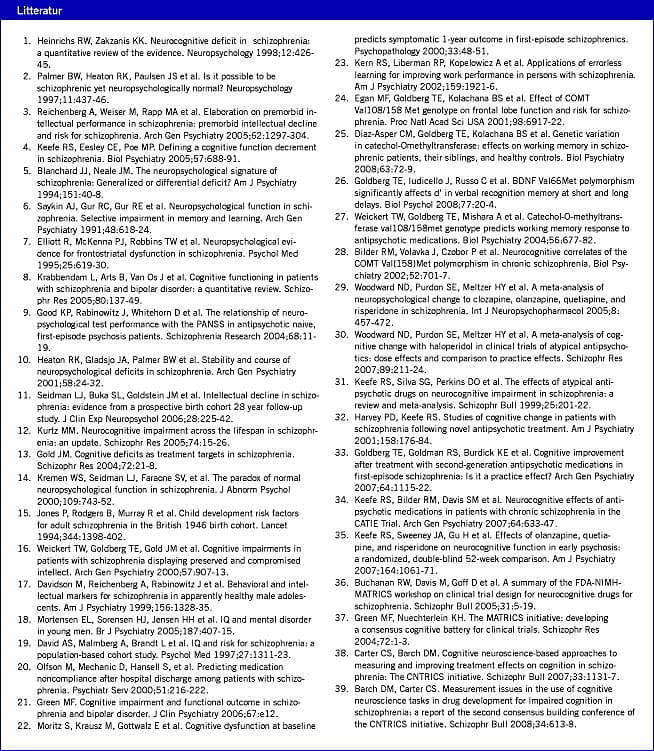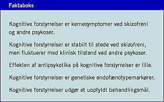 Lignende forstyrrelser ses ved andre psykotiske tilstande som psykoser inden for det affektive spektrum, men ved disse tilstande fluktuerer forstyrrelserne i højere grad med den kliniske tilstand og bedres ved remission af de psykotiske symptomer. Forstyrrelserne anses som sårbarhedsindikatorer over for udviklingen af sygdommene, særligt skizofreni. De kognitive deficit er af afgørende betydning for patienternes sociale og arbejdsmæssige prognose, og der er derfor et betydeligt incitament for at udvikle behandlingsstrategier, der kan bedre disse deficit. Artiklen opsummerer status for de kognitive forstyrrelsers relevans for psykotiske lidelsers patogenese og prognose. Endvidere karakteriseres nogle af de aktuelt relevante problemstillinger inden for forskningsfeltet. Disse omhandler: 1) kognitive forstyrrelser som genetiske endofænotypemarkører og 2) behov for nye metoder til at indentificere, udvikle og afprøve mulige medikamentelle behandlinger af kognitive forstyrrelser. Denne metodeudvikling foregår med integration af forskning fra basal neurovidenskab (mhp. identifikation af nye molekulære kandidater) til afprøvning af ækvivalente testparadigmer i både prækliniske og kliniske studier.