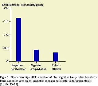 Forskningen i effekten af antipsykotiske præparater på kognitive forstyrrelser har været præget af metodologiske problemer som usammenlignelige doser af komparative præparater, manglende kontrol for retesteffekter på de kognitive test og manglede kontrol af tillægsmedicin og tidligere behandling med antipsykotika. Nye metaanalyser viser, at atypiske præparater har en positiv effekt på nogle kognitive forstyrrelser ved skizofreni, men at effektstørrelserne er små og af tvivlsom klinisk relevans [29-32]. Den gennemsnitlige effektstørrelse var 0,25 standardafvigelser, hvilket oversat til en IK-skala svarer til ca. fire IK-point. Nyere studier peger envidere på, at denne effektstørrelse svarer til den indlæringseffekt, der ses på testene [33]. Kognitive forstyrrelser udgør således et uopfyldt behandlingsmål (se Figur 1 ). Der er ikke fundet evidens for forskellig effekt af atypiske og typiske præparater, når lave og sammenlignelige doser anvendes. I de amerikanske multicenterstudier CATIE og CAFE fandt man samme konklusion som i metaanalyserne [31, 34, 35].