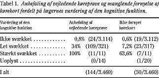 Tabel 1 viser, at effektvariablene (henvisning til vejledende køreprøve og fornyelse af kørekort) var signifikant afhængige af lægens vurdering af patientens kognitive funktion.