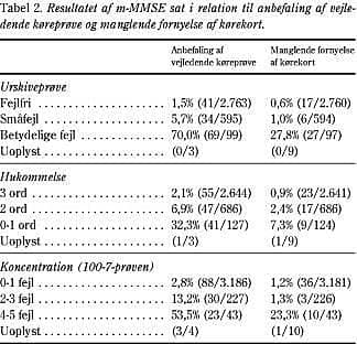 Tabel 2 viser, at effektvariablene (anbefaling af vejledende køreprøve og fornyelse af kørekortet) var afhængige af resultatet af m-MMSE. Sammenholdes dette resultat med Tabel 1, ses det, at ingen af de enkelte delelementer i m-MMSE alene er korreleret så stærkt til effektvariable som de praktiserende lægers samlede vurdering af patientens kognitive funktioner.