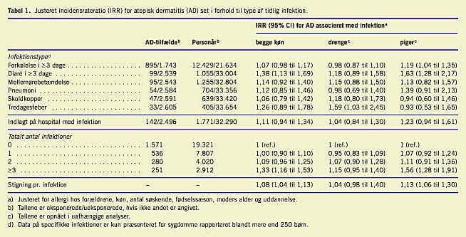 I alt 13.070 af de 24.341 børn havde mindst en infektionssygdom, inden de fyldte seks måneder, langt de fleste var forkølelse af mere end tre dages varighed (85%). Drenge havde flere infektionssygdomme end piger (55% mod 52%, p < 0,001). I alt 2.638 børn havde haft atopisk dermatitis, da de bl ev 18 måneder gamle; 1.474 (56%) drenge og 1.164 (44%) piger. Det at have haft mindst en infektionssygdom i de første seks levemåneder var associeret med atopisk dermatitis (incidensrateratio = 1,09 (95% konfidensinterval 1,00-1,19)). Tabel 1 viser resultaterne fordelt på type af infektion. Alle infektionssygdommene tenderede mod at være relateret til atopisk dermatitis. Associationen steg i styrke med antallet af infektioner (Tabel 1). Effekten af infektionssygdomme var ikke afhængig af, om forældrene havde allergisk sygdom. Justering for eksklusiv amning i de første fire levemåneder ændrede ikke på resultaterne.
