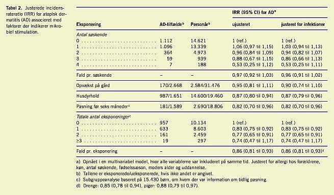 I en separat analyse dannede vi en score for tidlig mikrobiel stimulation bestående af faktorerne: tre eller flere søskende, tidlig pasning, husdyrhold og opvækst på gård. Efter justering for antal infektionssygdomme var dette score omvendt associeret med atopisk dermatitis, effekten pr. faktor var 0,86 (0,81-0,93) (Tabel 2). I den samme model var effekten af hver ekstra infektion 1,09 (1,03-1,14).