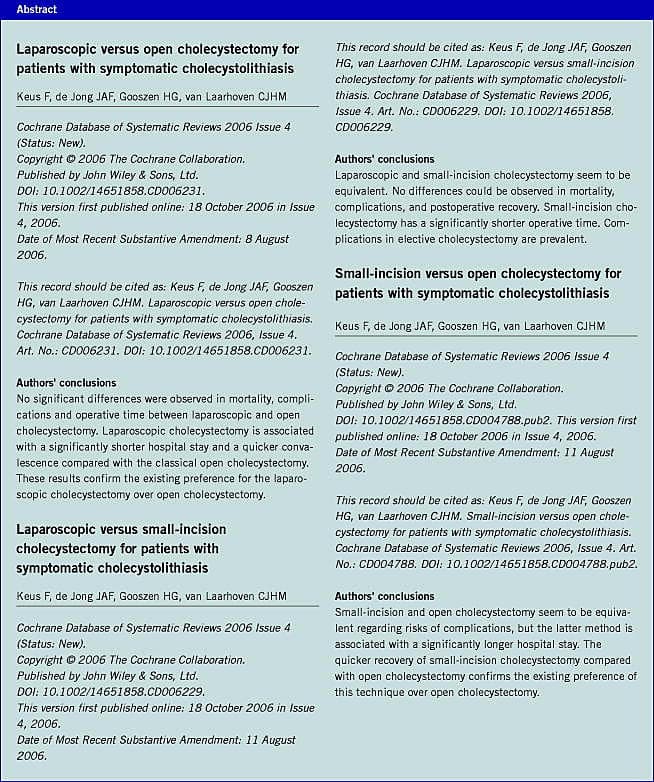 Den hurtige accept af den laparoskopiske kolecystektomi som den nye guldstandard skete uden baggrund i store, solide, randomiserede afprøvninger af de tre metoder over for hinanden. I dag foreligger der efterhånden en række randomiserede undersøgelser og Keus F et al har kritisk vurderet disse i følgende tre Cochrane-analyser: »Laparoscopic versus open cholecystectomy for patients with symptomatic cholecystolithiasis«, »Small-incision versus open cholecystectomy for patients with symptomatic cholecystolithiasis« og »Laparoscopic versus small-incision cholecystectomy for patients with symptomatic cholecystolithiasis«.