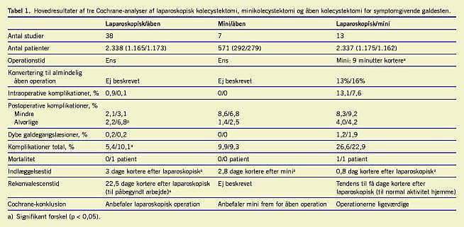 Tretten undersøgelser med I alt 2.337 patienter kunne bruges i analysen. Flere studier var af god metodologisk kvalitet. Der var ingen forskel på mortalitet og morbiditet mellem laparoskopisk kolecystektomi og minikolecystektomi, men i sammenligning med de to andre Cochrane-analyser var der i denne analyse en høj frekvens af komplikationer (Tabel 1). Dette skyldes især, at et stort multicenterstudie, hvori der også indgik patienter med akut kolecystitis bidrog med mange komplikationer. Hyppigheden af galdegangslæsioner er også høj, henholdsvis 1,2% og 1,9%. Der var ingen signifikant forskel på indlæggelsestiden, når kun studier af høj kvalitet analyseres, men en forskel på knap en dag mindre for laparoskopisk operation end for minioperation ved samlet analyse af alle inkluderede studier. Med samme mønster er der en tendens til kortere rekonvalescens (2,5 dage) efter laparoskopisk operation end for minioperation. Endelig fandt man en sig-nifikant kortere operationstid for mini-kolecystektomien (ni minutter) end for laparoskopisk operation.