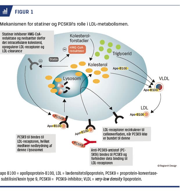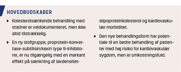 Statiner, eller HMG-CoA-reduktaseinhibitorer, har længe været en hjørnesten i behandling af dyslipidæmi. Disse stoffer er i mange studier påvist at kunne reducere hyppigheden af kardiovaskulær (CV)-morbiditet og mortalitet i flere forskellige populationer med høj risiko for kardiovaskulær sygdom (CVD) [1]. Statiner er førstevalgsbehandling ved dyslipidæmi og er hyppigt anvendt. I 2016 var ca. 700.000 danskere i behandling med et statin. Der er dog patientgrupper, som ikke opnår tilstrækkelig reduktion i lavdensitetslipoprotein (LDL)-kolesterolniveau med statiner, kombination af statiner og ezetimib eller andre lipidsænkende præparater. Observationsstudier viser, i modsætning til randomiserede studier, at 10-20% af de patienter, som behandles med statiner, ophører på grund af intolerans over for behandlingen [2, 3]. Endelig er der patienter, som trods sufficient behandling med statiner og ezetimib med markant reduktion af LDL-kolesterolniveau har gentagne CV-tilfælde [1]. I 2015 blev de to første lægemidler i den nye klasse af proprotein-konvertase-subtilisin/kexin type 9-inhibitorer (PCSK9i) godkendt af de amerikanske (FDA) og europæiske (EMA) lægemiddelmyndigheder til behandling af hyperlipidæmi. Det er monoklonale antistoffer, som hæmmer proteasen PCSK9. I denne artikel vil vi fokusere på PCSK9’s biologiske rolle i LDL-kolesterolmetabolismen, virkning og bivirkninger af PCSK9-inhibition, effekt på CVD og nuværende status for anvendelsen af disse lægemidler i Danmark. Principperne for PCSK9 og foreløbige resultater af PCSK9-inhibition er tidligere gennemgået i en artikel fra 2015 [4].