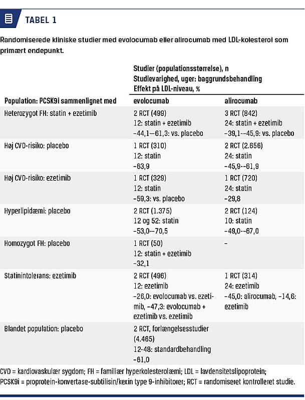 er baseret på monoklonale antistoffer, tilgængelige. Begge PCSK9i, alirocumab og evolocumab, er godkendt af FDA og EMA i 2015. Alirocumab er godkendt til behandling af voksne patienter med primær hyperkolesterolæmi (altså ikke sekundær til anden sygdom) eller blandet dyslipidæmi (inkl. heterozygot FH) i kombination med anden lipidsænkende behandling hos patienter, der ikke når LDL-kolesterolmål, eller hos statinintolerante. Evolocumab har samme indikation, men ud over dette også homozygot FH. Endnu en PCSK9i, bococizumab, har været under udvikling, men blev standset pga. udvikling af antistoffer mod præparatet [11]. I studier med bococizumab fandt man kun hos højrisikopatienter en signifikant effekt med hensyn til reduktion i kardiovaskulære tilfælde [11].