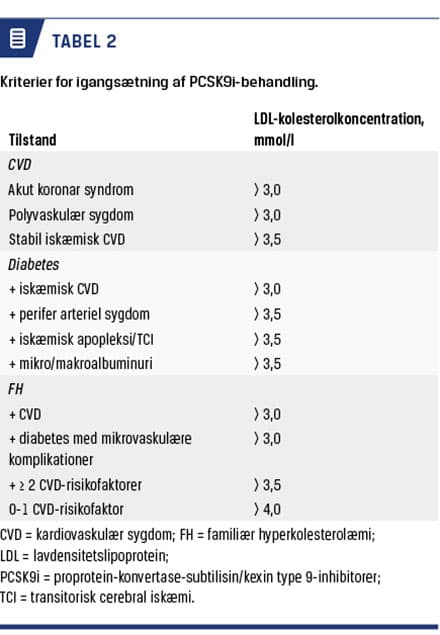 Kun specialister i kardiologi og endokrinologi (alirocumab) og specialister i kardiologi, endokrinologi og neurologi (evolocumab) har ordinationsret, da behandling med PCSK9i er bekostelig (ca. 60.000 kr./år). PCSK9i er omfattet af bekendtgørelsen om vederlagsfri udlevering og er begrænset til patienter med FH samt patienter, der har iskæmisk hjerte-kar-sygdom, diabetes med mikro-/makroalbuminuri, perifer arteriel sygdom eller iskæmisk apopleksi/transitorisk cerebral iskæmi, meget høj risiko for CV-hændelser og et LDL-kolesterolniveau > 3,0-4,0 mmol/l trods maksimalt tålt lipidsænkende behandling. Kriterierne fremgår af Tabel 2 og Medicinrådets behandlingsvejledning [30].