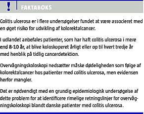 Det anbefales i udlandet [1, 2, 11], at UC-patienter fra 8-10 år efter symptomdebut regelmæssigt koloskoperes med henblik på tidlig cancerdetektion. I et Cochrane-review af Collins et al [17] forsøgte man imidlertid forgæves at eftervise, at overvågningskoloskopi forlænger overlevelsen blandt UC-patienter.