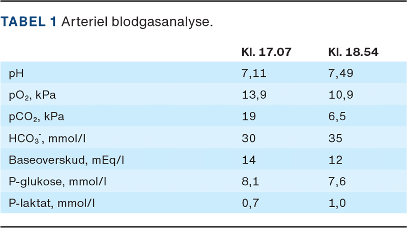 Initielt præsenterede han sig med Glasgow Coma Scale (GCS) score fem (Øjne 2, Verbalt 2, Motorik 1) og normale vitalparametre fraset respirationsfrekvens på 30/min. Arteriel blodgas viste hyperkapnisk acidose (Tabel 1). På denne baggrund blev CO2-narkose mistænkt som årsag til det nedsatte bevidsthedsniveau. Patienten var afebril og uden nakkestivhed, ligesom pupiller blev fundet egale og lysreagerende. Forsøgsvis blev der givet naloxon i alt 1,2 mg uden effekt. Patienten blev intuberet og overflyttet til intensivafdelingen, hvor der blev foretaget CT af cerebrum og thorax, som begge var uden kliniske fund. I en lumbalpunktur fandt man klar spinalvæske, hvor celletælling og dyrkning ikke viste noget abnormt. Selv om der ikke var anamnese med brug af benzodiazepiner, blev der forsøgsvis givet flumazenil 0,2 mg × 2 uden effekt. Efter påbegyndt respiratorbehandling viste arteriel blodgas to timer senere let alkalose med nærnormal pCO2 (Tabel 1). Sedationen med remifentanil blev slukket, men patienten havde vedvarende lav GCS-score og insufficient egen respiration. Urin blev taget fra til toksikologiscreening og var positiv for metamfetamin, hvilket ville medføre opstemthed, agitation og store pupiller modsat det aktuelle kliniske billede. Det fremgik af patientens medicinliste, at patienten seks dage forinden var opstartet i mirtazapin 7,5 mg til natten. Næste dag vågnede patienten helt op og kunne ekstuberes. Patienten oplyste, at han først påbegyndte mirtazapin dagen før indlæggelse samt ved en fejl havde taget det igen om morgenen på dagen for indlæggelse. Der var stærk mistanke om mirtazapin som udløsende årsag til koma, hvorfor mirtazapin blev seponeret.