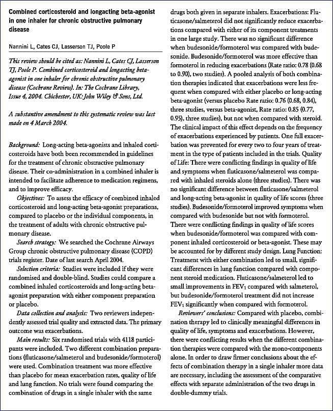 For det første er analysen baseret på relativt få studier, som dog alle er vurderet til at være af god metodologisk kvalitet. Men da definitionen af flere kliniske endepunkter (f.eks. eksacerbationer) ikke har været konsistent fra undersøgelse til undersøgelser, ha r metaanalyse af data ikke været mulig, og forfatterne har i flere tilfælde været henvist til alene at referere resultaterne for de enkelte undersøgelser. Når man dertil lægger en a priori-beslutning om at behandle resultaterne for de enkelte indholdsstoffer separat og uden hensyntagen til den anvendte dosis frem for at betragte begge ICS hhv. LABA under et, bliver muligheden for at drage yderligere konklusioner beskeden.
