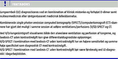 Med de over 25 hybridskannere, der i øjeblikket befinder sig i Danmark, og som er egnede til V/Q-SPECT i kombination med lavdosis-CT uden kontrastindgift, bør denne undersøgelse være førstevalg ved LE-diagnostik. Undersøgelsen tilbydes i øjeblikket på mindst otte afdelinger i landet, og tallet stiger støt.