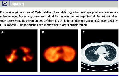 Indførelsen af den tredimensionelle single photon emission computed tomography (SPECT)-teknik i stedet for den traditionelle planare skintigrafi har imidlertid forbedret den diagnostiske ydeevne ved V/Q-skintigrafi med det resultat, at langt flere undersøgelser bliver konklusive [9-12]. Den væsentligste fordel ved SPECT sammenlignet med planar skintigrafi er, at billederne kan ses i sagittale, aksiale og koronale snit, således at eventuel overlejret normalaktivitet kan elimineres [12]. PIOPED-studiets beslutningsalgoritme tog udgangspunkt i en opdeling af sandsynlighed for LE i fire kategorier, hvilket resulterede i en stor gruppe af patienter (73%), der havde intermediær sandsynlighed [4, 5]. Det betyder, at andre undersøgelsesmodaliteter må tages i brug. V/Q-SPECT-undersøgelsen er baseret på færre kategorier, hvor alle mismatch 'ede defekter ved V/Q-SPECT-undersøgelsen tolkes som LE, forudsat at lavdosis-CT ikke giver en anden forklaring.
