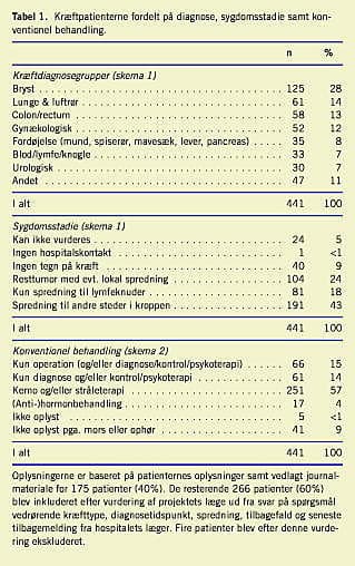 Patienterne blev fulgt med seks spørgeskemaer og interview med enkelte patienter. I denne artikel benyttes data fra de to første spørgeskemaer, der blev udleveret til patienterne ved inklusion i undersøgelsen samt efter en uge. Oplysninger om kræftdiagnose og sygdomsstadie er taget fra skema 1. Oplysninger om konventionel behandling samt kommunikationen med lægerne er taget fra skema 2. Skema 2 blev besvaret af 400 patienter. Mellem skema 1 og skema 2 døde 39 patienter, og to trådte ud af undersøgelsen (Tabel 1 ).
