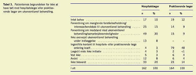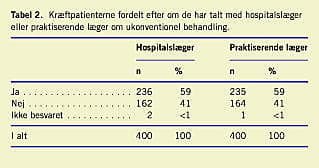 Nyere udenlandske undersøgelser har vist, at 54-74% af kræftpatienter fortæller lægerne om deres brug af UB, og at lægerne generelt opfattes som ligeglade eller i opposition til UB [4, 6]. En dansk undersøgelse af ti kræftpatienter har påpeget, at praktiserende læger opfattes som mere positive over for UB end hospitalslæger [3]. I denne undersøgelse, der blev baseret på 441 kræftpatienter, genfandt vi det samme mønster.