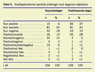 Begge spørgsmål gav for, »hvis ja; hvordan var lægens/lægernes reaktion« mulighed for at angive en eller flere af følgende svarmuligheder: accepterende, uden holdning, afvisende, frarådende, irriteret, nysgerrig, opmuntrende, samarbejdende, ved ikke. Det mest almindelige var, at patienterne angav et svar for både hospitalslæger og praktiserende læger (47%). To svar blev angivet af 30% for hospitalslæger og 35% for praktiserende læger. Tre svar blev angivet af 16% for hospitalslæger og 6% for praktiserende læger. Resten angav fire svar; 7% for hospitalslæger og 6% for praktiserende læger. Efterfølgende blev svarene samlet i tre kategorier. Svarene accepterende og uden holdning blev kategoriseret som neutral reaktion. Svarene afvisende, frarådende og irriteret blev kategoriseret som negativ reaktion. Mens svarene nysgerrig, opmuntrende og samarbejdende blev kategoriseret som positiv reaktion. Ud fra materialet kunne vi ikke afgøre, hvor mange læger patienterne havde talt med. Men vi kunne se, at når patienterne vurderede reaktionerne fra hospitalslæger, var der ofte tale om flere læger med forskellige reaktioner - nogle med navn og afdeling. For at kunne beskrive patienternes samlede erfaringer med hhv. hospitalslæger og praktiserende læger blev alle svar summeret i én variabel, der således udtrykte den enkeltes patients samlede erfaringer med lægernes reaktioner.
