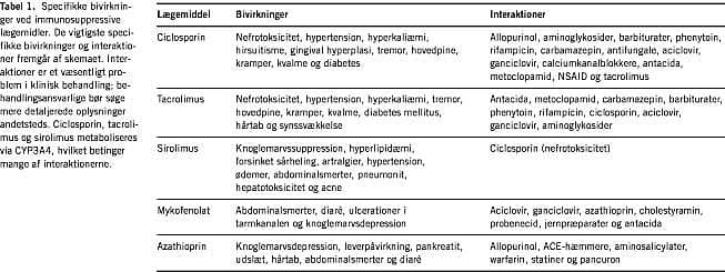 Når der ses bort fra transplantation mellem enæggede tvillinger, forudsætter organtransplantation immundæmpende behandling, som har betydelige konsekvenser for patienten. Risikoen for sygdomme forårsaget af mikroorganismer og udvikling af neoplastiske tilstande øges, og de anvendte medikamenter har hver deres korttidsbivirkninger, langtidsbivirkninger og interaktioner (Tabel 1 ).