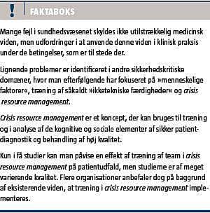 I flere internationale og et dansk studie har man påvist, at utilsigtede hændelser ses ved ca. 9% af alle indlæggelser [1, 2]. I de seneste ti år har der været en stigende interesse for at lære af sådanne hændelser for at forbedre patientsikkerheden. Undersøgelser viser, at mange af disse hændelser kan tillægges menneskelige fejl [3]. Årsagerne er således ikke utilstrækkelig medicinsk viden, men udfordringer i at anvende denne viden i klinisk praksis under de betingelser, som er til stede der [4]. Et centralt begreb er »menneskelige faktorer«, som her defineres som samspillet mellem menneske og omverden. En af grundtankerne er, at fejl i praksis er uundgåelige i komplekse omgivelser, hvor individet interagerer med andre individer og med teknologi [5]. I visse højrisikoorganisationer, såsom luftfarten og atomkraftindustrien, har man på baggrund af analyser af hændelser udviklet og implementeret initiativer til at forebygge menneskelige fejl, herunder træning af crisis resource management (CRM).