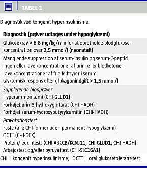 Neonatal hypoglykæmi med behov for en glukoseinfusionsrate > 6-8 mg/kg/minut bør føre til udredning for CHI. Sekundære former (maternel diabetes, asfyksi og medikamentelle former) skal være udelukket. Neonatal hypoglykæmi defineres som en glukoseværdi < 2,5 mmol/l efter to timers levetid. Hos patienter, der er over enmånedsalderen, defineres hypoglykæmi som en glukosekoncentration < 3,2 mmol/l. Differentialdiagnostisk bør epilepsi og andre årsager til hypoglykæmi, inkl. Münchhausen by proxy overvejes, mens hyperinsulinisme pga. insulinom kun sjældent ses hos børn i førskolealderen [3]. Serum (S)-insulin og C-peptid skal bestemmes under igangværende hypoglykæmi, hvor værdier ikke kun over, men også i normalområdet indikerer hyperinsulinisme [13, 14], idet insulin- og C-peptid-sekretionen ved hypoglykæmi normalt supprimeres. Ofte fejltolkes en »normal« værdi af S-insulin og C-peptid, fordi den ikke ses i korrekt sammenhæng med den samtidige hypoglykæmi. Ved sensitive målemetoder er de nedre grænser for S-insulin og C-peptid dog ikke fastlagt præcist hos børn, og suppression hhv. insufficient suppression kan forekomme hos samme patient, hvorfor diagnosen kan være vanskelig at stille uden genetisk afklaring [14].