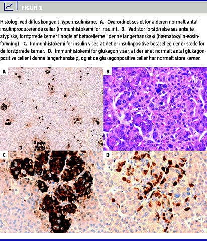 Histologisk ses der to hovedtyper af CHI, den diffuse og den fokale type. Diffus CHI ses hos 35-60% af opererede patienter [4, 15, 16] og er karakteriseret ved forstørrede cellekerner i en eller flere hypertrofiske, insulinproducerende betaceller i de langerhanske øer, diffust fordelt i pancreas (Figur 1 ).