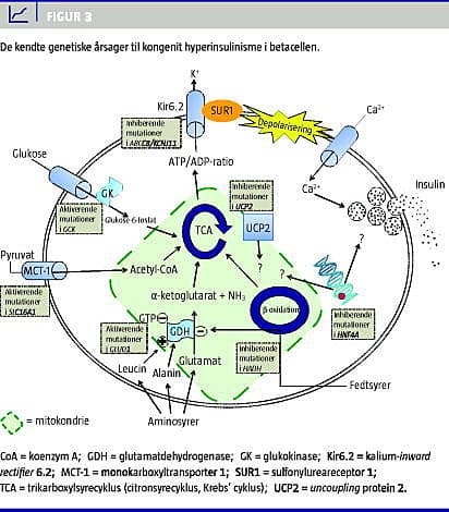 I dag kendes mutationer i otte forskellige gener ved nonsyndromal CHI [1, 5, 19-21], men den genetiske årsag er stadig uafklaret hos 40-50%. Mutationer i ABCC8 eller KCNJ11 ses hos 50-80% med svær CHI (opererede pa tienter) [4, 16], mens genotypen kun er klarlagt hos omkring 25% af de medicinsk responsive patienter [22]. Fælles for mutationerne er, at de fører til en forstyrret eller ophævet kobling mellem glukosekoncentrationsniveauet og betacellens insulinsekretion.