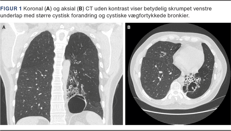 Der opstod nyt anfald af epistaxis ti timer efter operationen, denne gang ledsaget af sikker hæmoptyse. Røntgen af thorax viste bronkieektasier og bullaedannelse i venstre underlap. Ved gennemgang af tidligere billeddiagnostik forelå CT af thorax, som var udført i andet udredningsforløb (Figur 1). På skanningen var venstre underlap cystisk omdannet, hvilket på scanningstidspunktet var tolket som postinfektiøse forandringer og grundet fravær af kliniske luftvejssymptomer var der ikke udredt yderligere.
