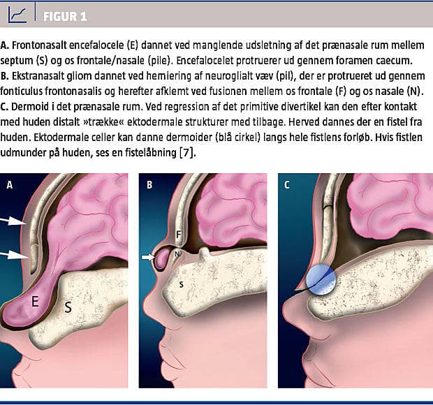 Nasale dermoider forekommer enten som intranasale- eller intrakraniale udfyldninger eller som ekstranasale tumorer beliggende i området mellem glabella og apex nasi [8]. De forekommer oftest som isolerede cystiske tumorer, og afhængigt af den mangelfulde regrediering af det durale divertikel kan der forekomme en ekstern forbindelse til huden i form af en fistelgang. I nogle tilfælde persisterer der kun en fistelåbning (pit). Der er beskrevet pits hos 45-84%, og de kan være lokaliseret fra glabella til basis af columella på overlæben [2, 6, 9, 10]. Nasale dermoider indeholder både ektodermalt og mesodermalt materiale. De udgør 1-3% af alle dermoider i kroppen [2] og 8-10% af alle dermoider i hoved-hals-området [9]. Ofte ses der hårvækst i fistelåbningen, hvilket indikerer, at tumoren er en dermoid.